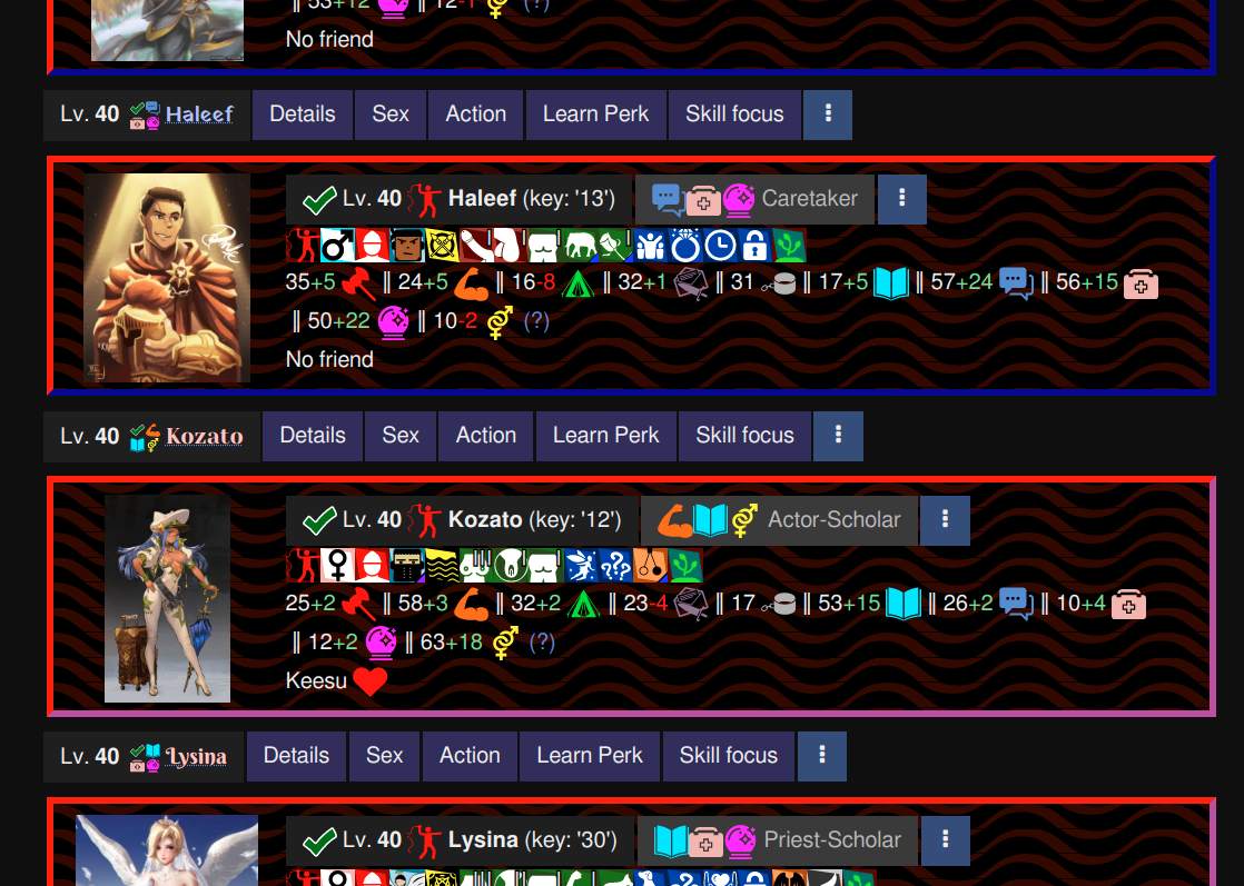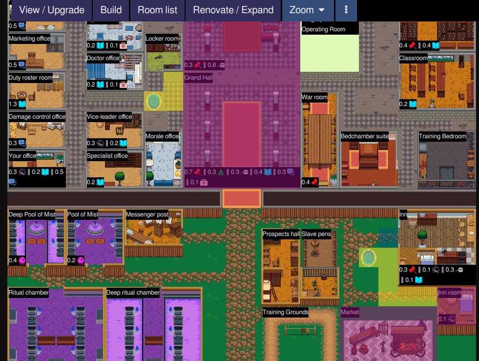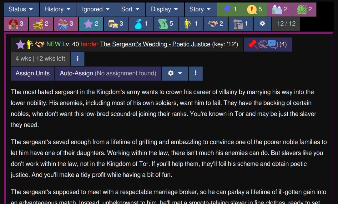 Key designs. This game is designed to be a short-story-teller machine: the core gameplay loop involves assigning groups of slavers to quests, reading what happens to them, and finally reaping the quests’ rewards. This game is complete: all features, bugfixes, polish, balancing, and originally planned stories are finished. But improvements and community-made contributions are still being added continuously to the game.